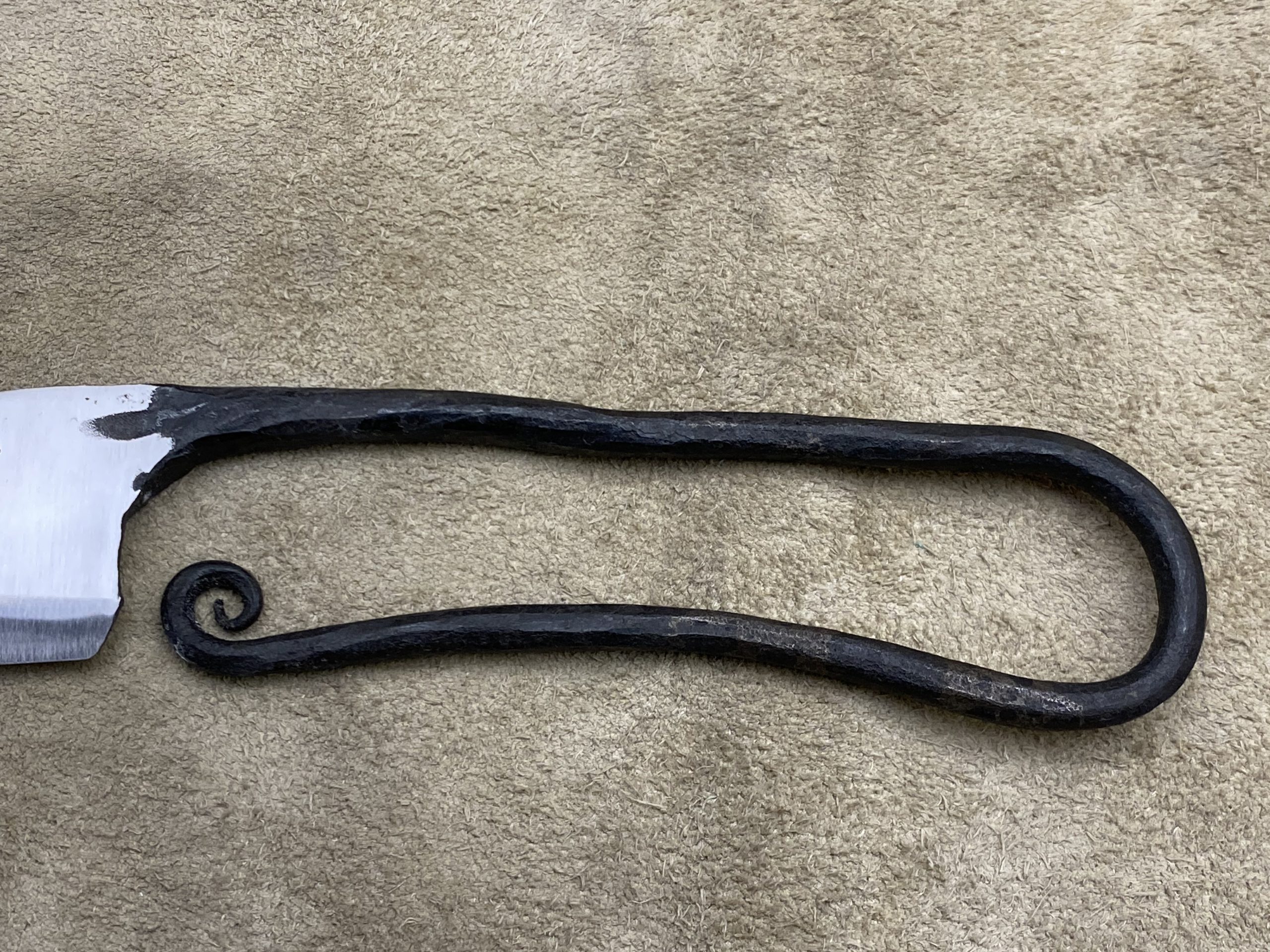 Der Griff ist aus dem gleichen Stück Stahl wie die Klinge geschmiedet und in eine handliche Form geschwungen. Das bietet einen sehr simplen und rustikalen Look, ganz wie auf dem Bauernhof oder im Mittelalter.